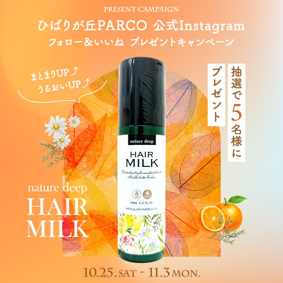 キャンペーン期間中、ひばりが丘PARCO公式Instagramをフォロー&キャンペーン投稿に「いいね!」した方の中から抽選で5名様に、3F organic「ネイチャーディープ ツヤ髪ミルク<洗い流さないトリートメント>」をプレゼント!