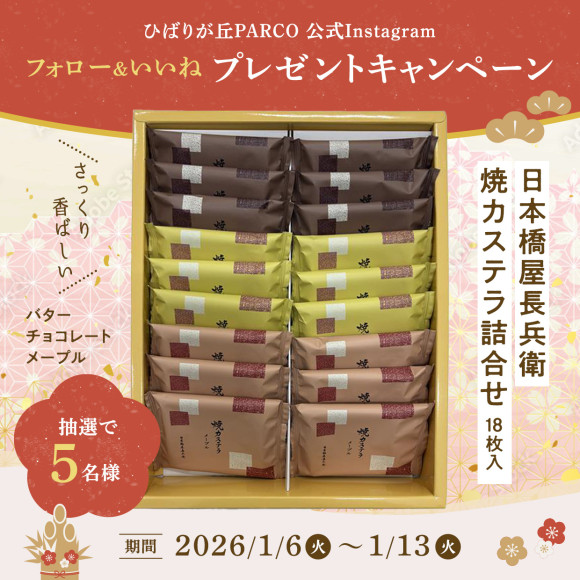 キャンペーン期間中、ひばりが丘PARCO公式Instagramをフォロー&キャンペーン投稿に「いいね!」した方の中から抽選で5名様に、1F 日本橋屋長兵衛「焼カステラ詰合せ(18枚入)<バター・チョコレート・メープル>」をプレゼント!