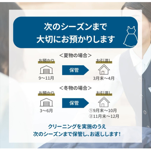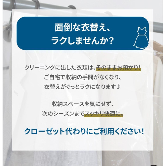 夏物・冬物などシーズンが終わった後の衣料品をお預かりし、クリーニングを実施のうえ次のシーズンまで保管し、お返しするお手軽な保管サービスです。