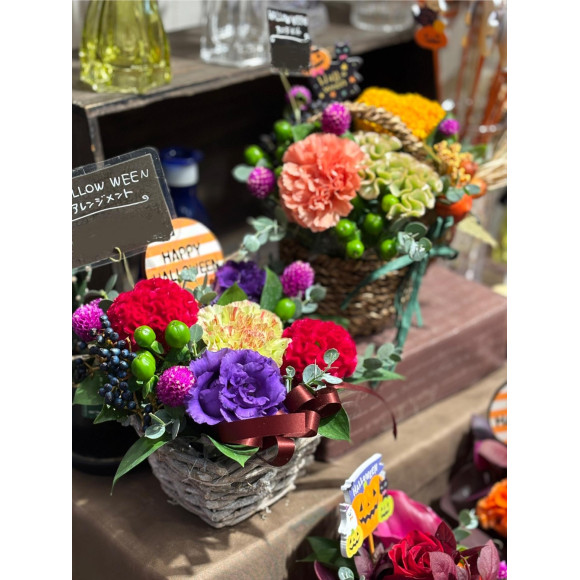 ハロウィンカラーをとり入れてかわいいアレンジメントできました!