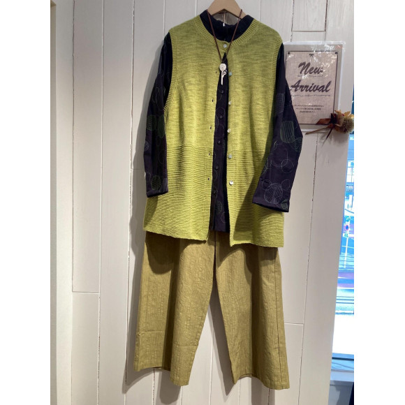 チュニック丈のニットベストと