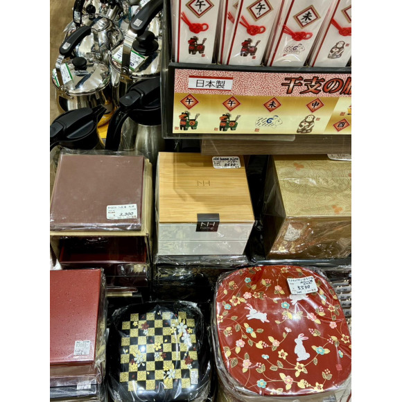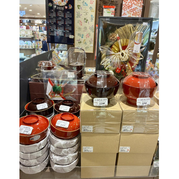店内はもうお正月の気配、華やかなお重や雑煮碗、祝い箸など、お正月用品を各種取り揃えております。