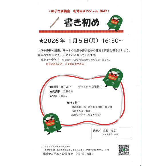 書き初め ~お子さま講座 冬休みスペシャル1DAY ~ ご案内