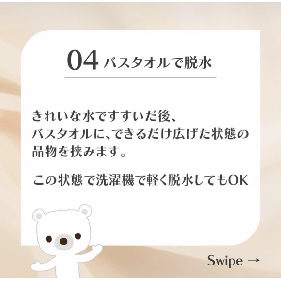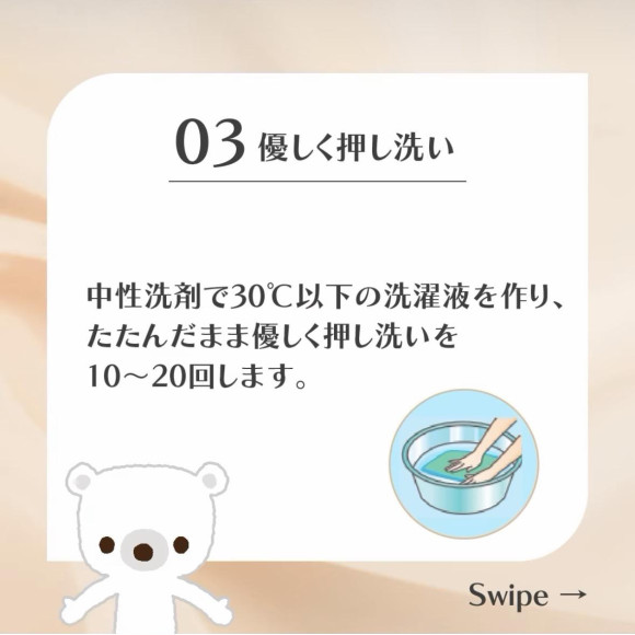 中性洗剤で30℃以下の洗濯液を作り、優しく押し洗いを10~20回します