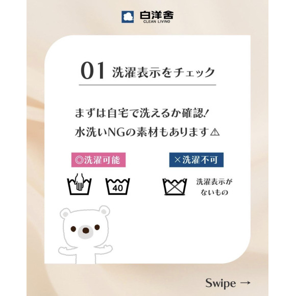 最初に自宅で洗えるかどうか洗濯表示を確認しましょう