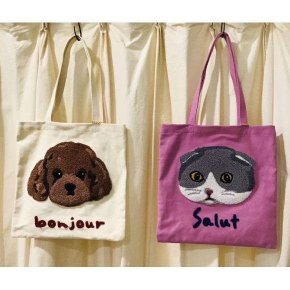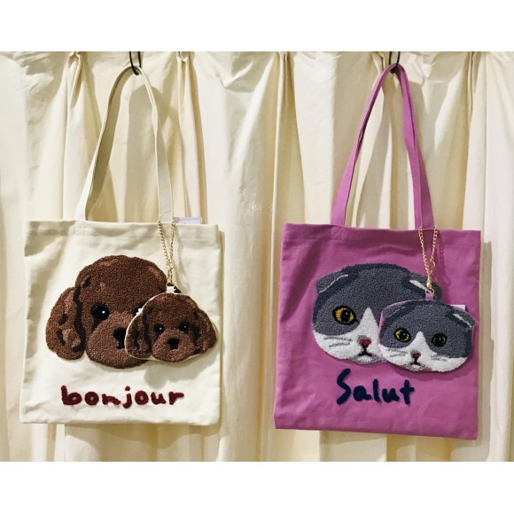 サガラ刺繍が素敵な猫と犬モチーフのマチ無しトートバッグとポーチが入荷しました(*^^*)