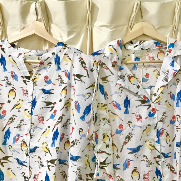 野鳥の手書きタッチが可愛い半袖の開襟シャツワンピース♪